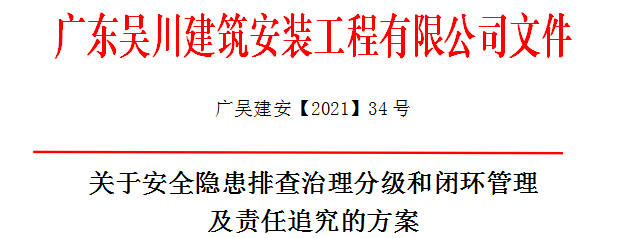 為建立安全隱患排查治理長效機制,強化安全生產(chǎn)主體責(zé)任,加強安全隱患治理,防止和杜絕事故發(fā)生,保障施工項目的安全生產(chǎn),現(xiàn)結(jié)合公司的實際,特制定安全隱患排查治理分級和閉環(huán)管理及責(zé)任追究的方案。