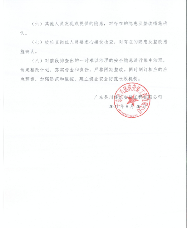 (三)B類安全隱患由技術(shù)質(zhì)安部按要求制定整改方案進(jìn)行整改,整改完成后由公司質(zhì)安部對整改情況組織驗收,報公司總經(jīng)理審核簽字銷號。
